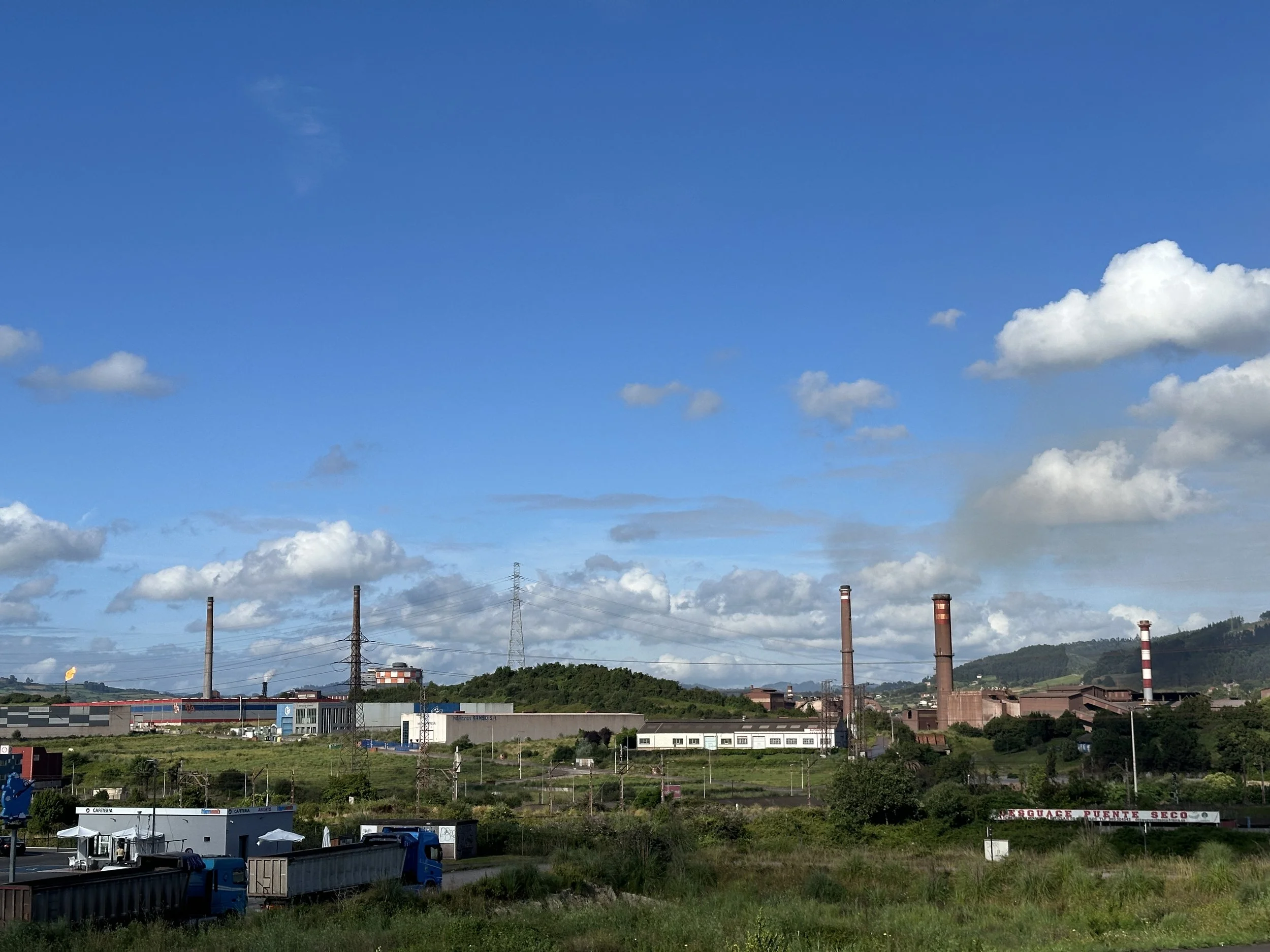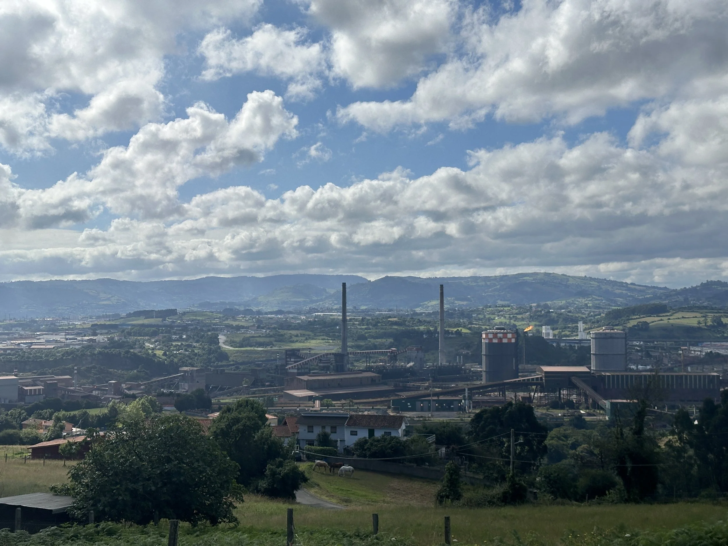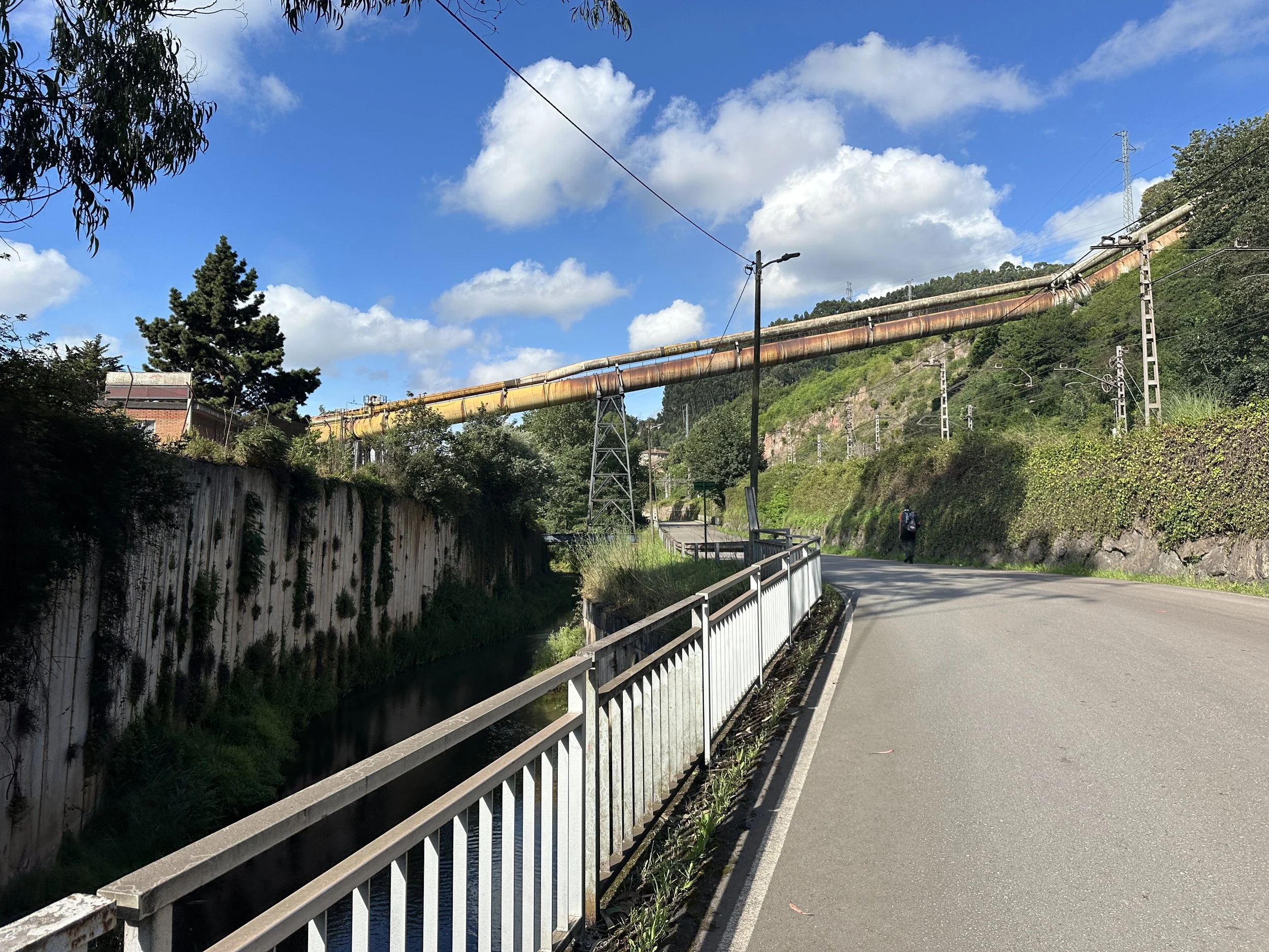 Crossing under a highway past an abandoned weigh station, we walked along a short stretch of river, following a road that slowly weaved its way up into the hillsides, offering more views of the enormous steel manufacturing operation, a scare on what was otherwise the typical Asturian landscape of rolling green hills. I felt bad for those that lived in the homes along the hillsides that we passed. Built in great locations overlooking what was likely once a nice green valley, the view now housed a tremendously hideous factory. It was hard to believe anyone would have put a home there after the factory was already built.