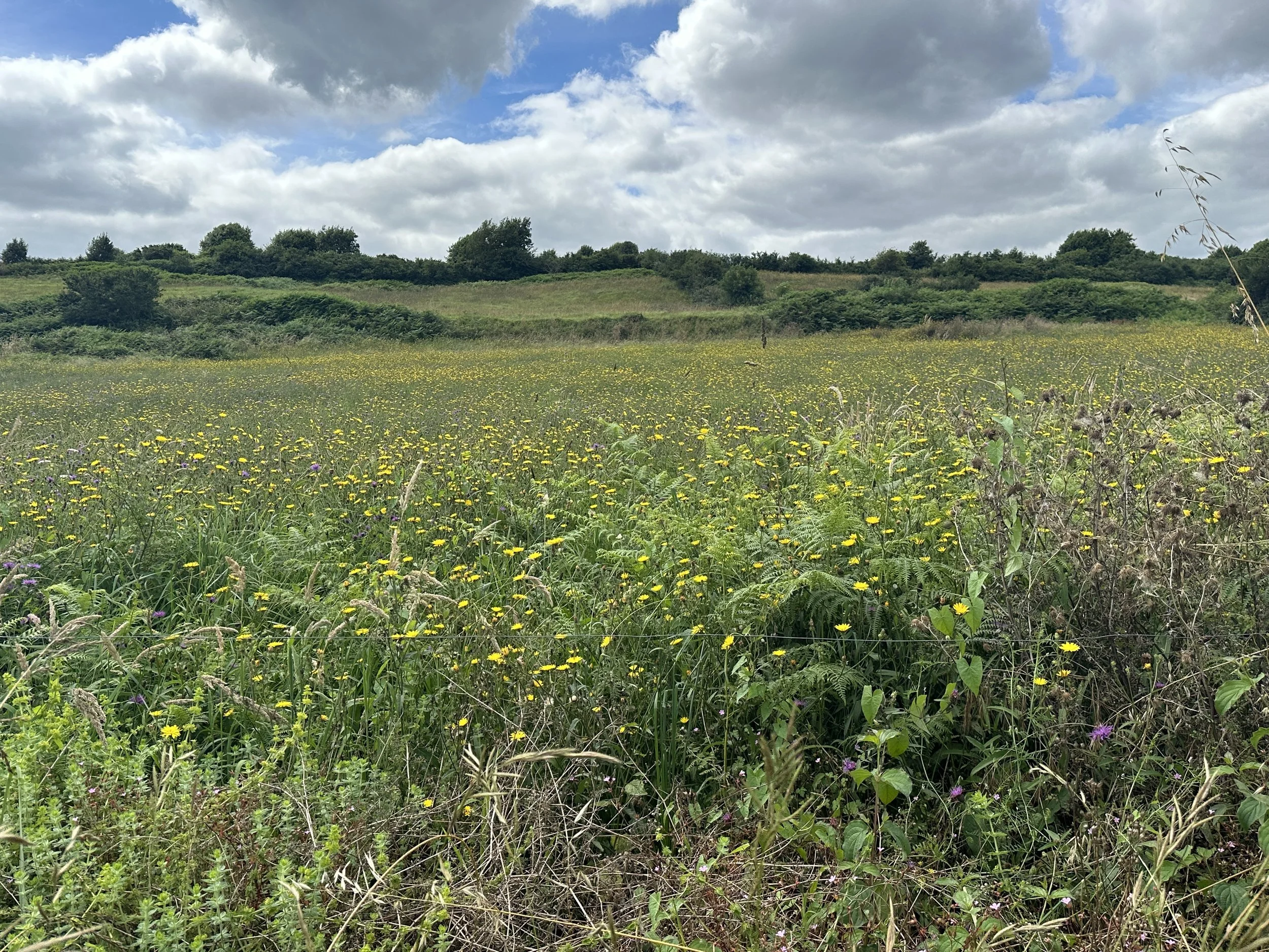 The walking from here was flat and easy. Though the day was bright and blue, and most of the route was quite exposed, there were enough clouds to shroud us from the worst of the sun and light breezes to keep us cool as we walked. The landscape was a mix of fields – crops, weeds, flowers – sometimes tall grasses in the ditches blocked any further view. But it was always green.