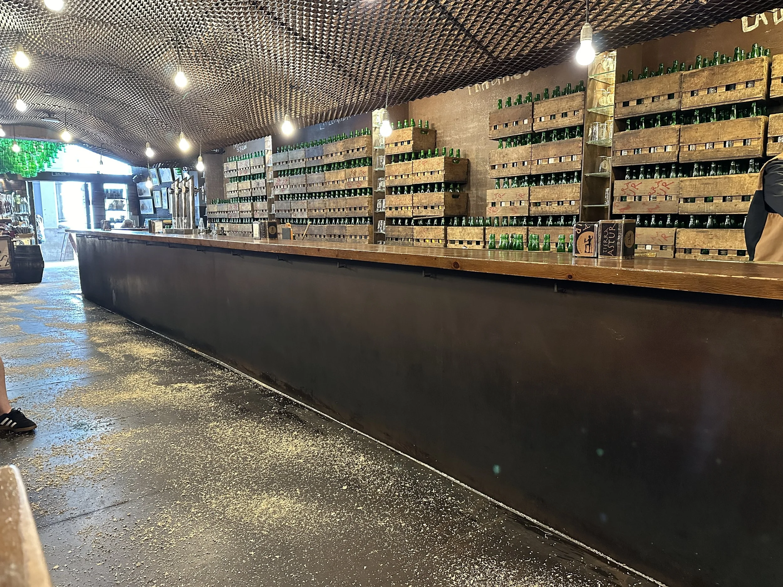 A traditional cider house, the waiters poured the cider for you, holding the bottle high in the air and pouring into the glass far below. The cider would splash just along the edge of the glass, a target that seemed very close to missing the glass altogether. Each time, they would pour only a small amount and when they saw that your glass was empty, they would be by again to refill it. Owing to the pouring method, which creates a bit of splashing, the floor was dusted in sawdust, another attribute of traditional sidrerias. (Though they forgo the sawdust at the sidrerias where they are using the electronic bottle/straw contraptions to pour/aerate the cider). This was the first place we’d been that had the sawdust on the floor.
