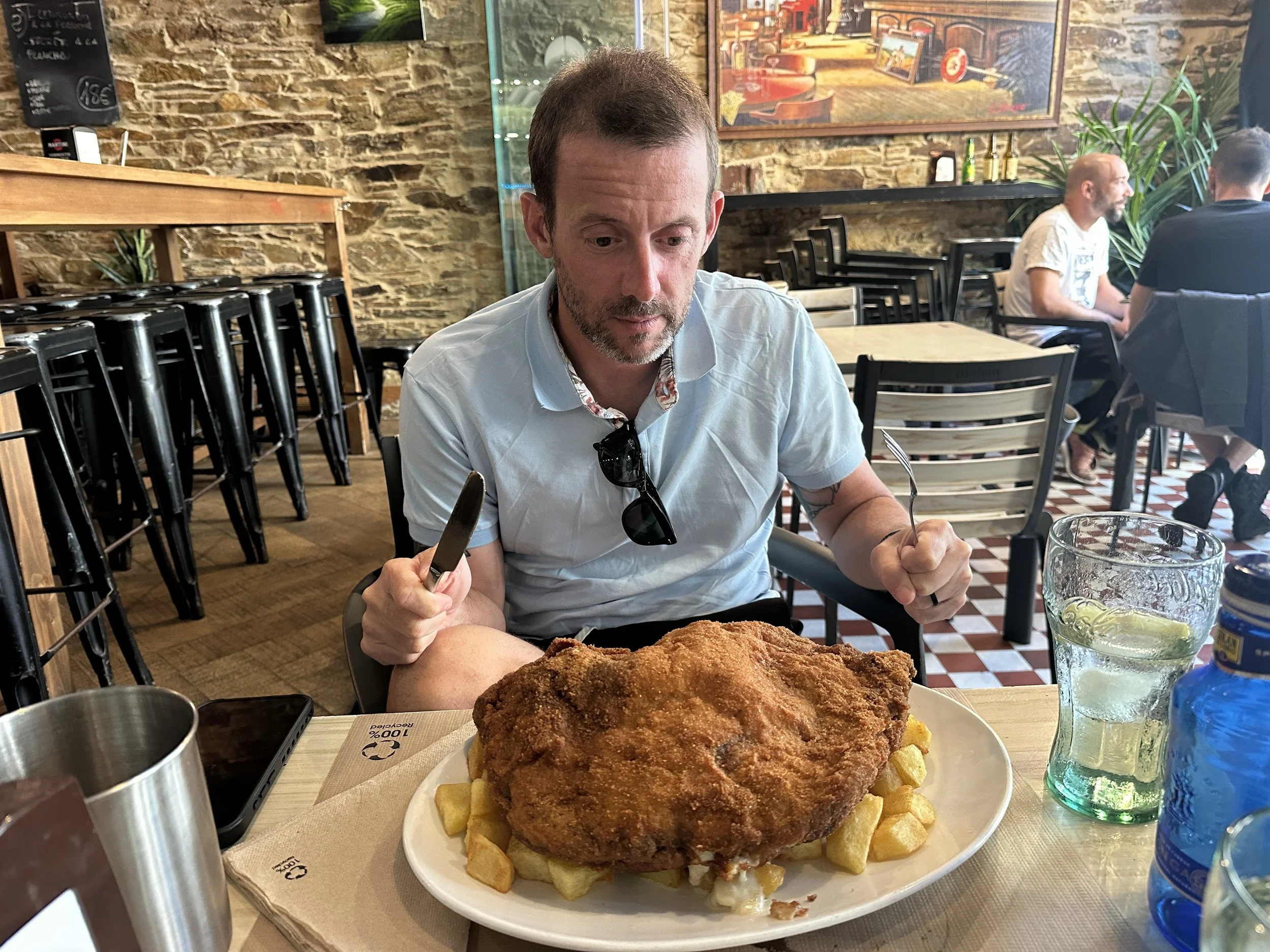 Arriving after 5pm, it had felt like a very long day. After getting ourselves cleaned up and relaxing for a while, we did finally peel ourselves off the bed and out once more for dinner. Here, Shawn made the mistake of ordering a ‘medio’ (half) cochopo, only to find out – once it arrived at our table – that it would feed four people. I helped him out a little bit, but had my own dinner to attend to. It only seemed right to kick off our entrance into Galicia with Zanburiñas, tasty Galician scallops.