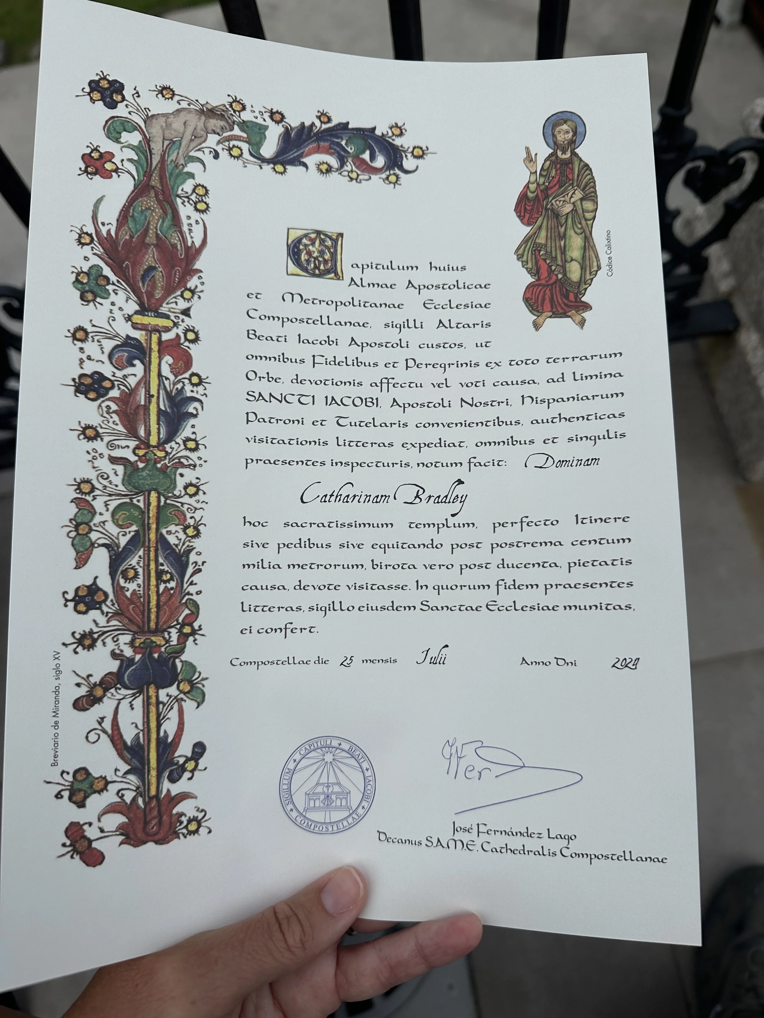 After a couple of questions about our starting point and a very brief look through our stamped Pilgrim’s Credential booklet, within seconds we were each holding our Compostela, the document that certified our completion of the pilgrimage. Written in Latin, it included our finish date and a lot of things that I can’t read. My given name, Katherine, was spelled as ‘Catherinam’, which I’m not sure is even correct as a Latin translation, or just a typo. Whatever. At least Catherinam Bradley had officially completed this pilgrimage. Whoever she was.