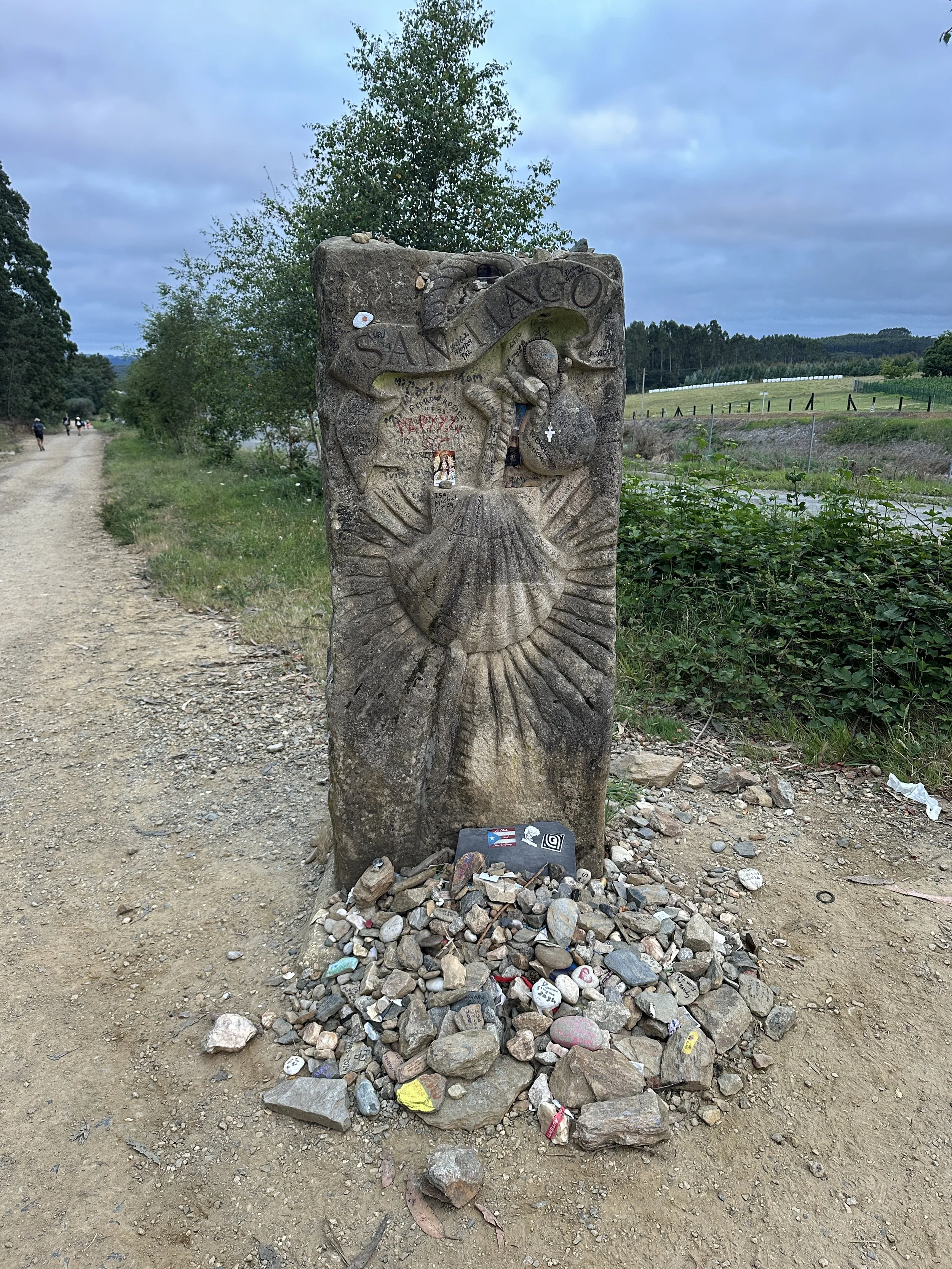 What I did not anticipate was how many people would be nearly racing to get to there. A couple examples from the morning. A little over an hour into our walk, I stopped along the side of the trail to take photo of a stele that said Santiago and had the scallop shell design emblematic of the trail. Within the few extra seconds it took to stop for this quick photo, a woman rushed up behind me to take her own photo – which I’m pretty sure my back must have been in – and hurried away, madly stomping her one trekking pole into the ground. You haven’t got a few seconds to wait for a photo? You’re booking yourself too tight.
