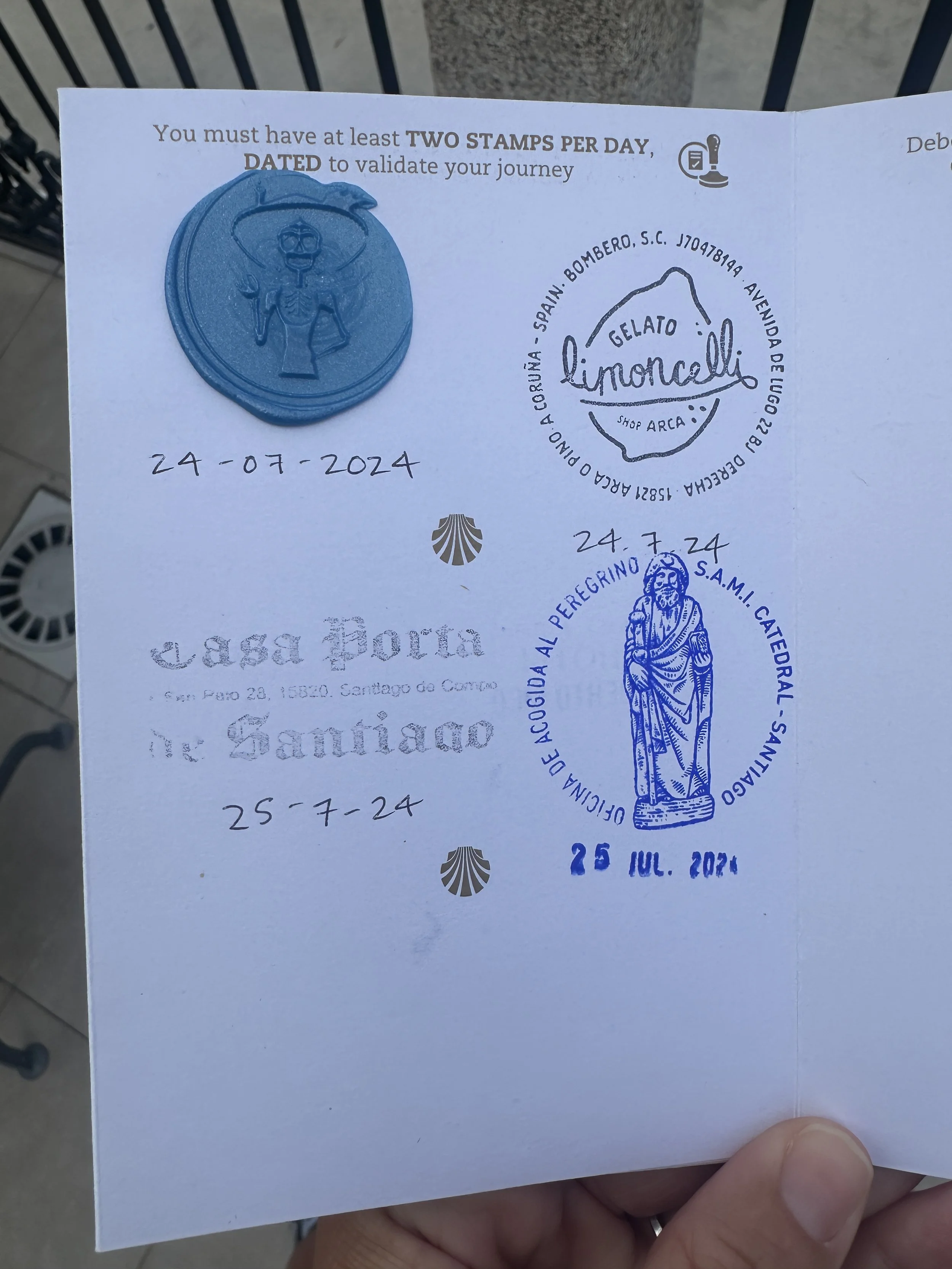 The final stamp in the Pilgrim Credential. Also, yes – I have a stamp from a gelato shop. Who doesn’t?