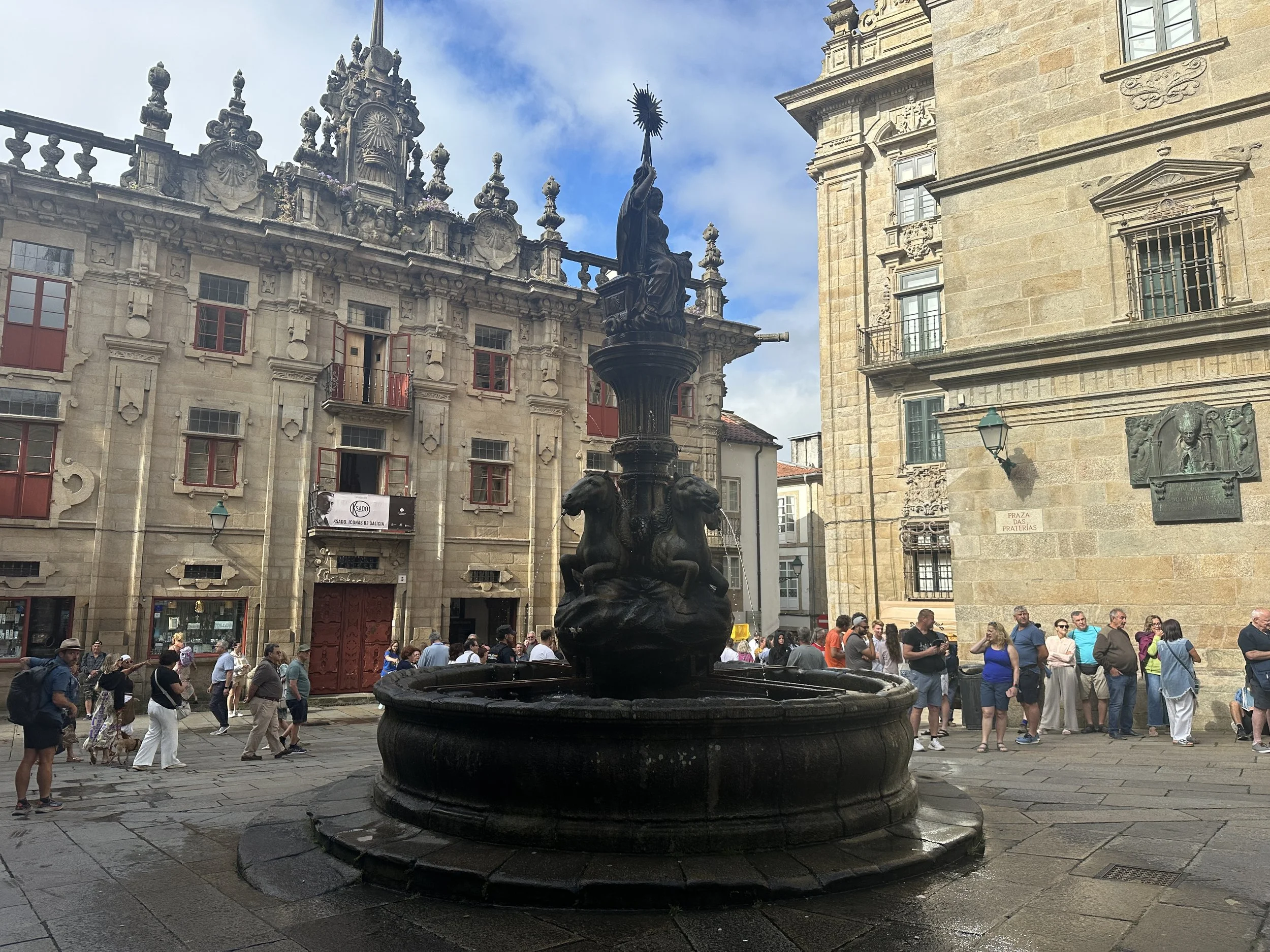 The Camino de Santiago routes technically end at the Catedral de Santiago de Compostela, where the remains of Saint James are believed to be buried. Most pilgrims end their hikes on the large plaza in front of the cathedral, Plaza Obradoiro, taking photos with the cathedral in the background in celebration of their achievement. We head for the plaza (actually ‘praza’ in Galician).