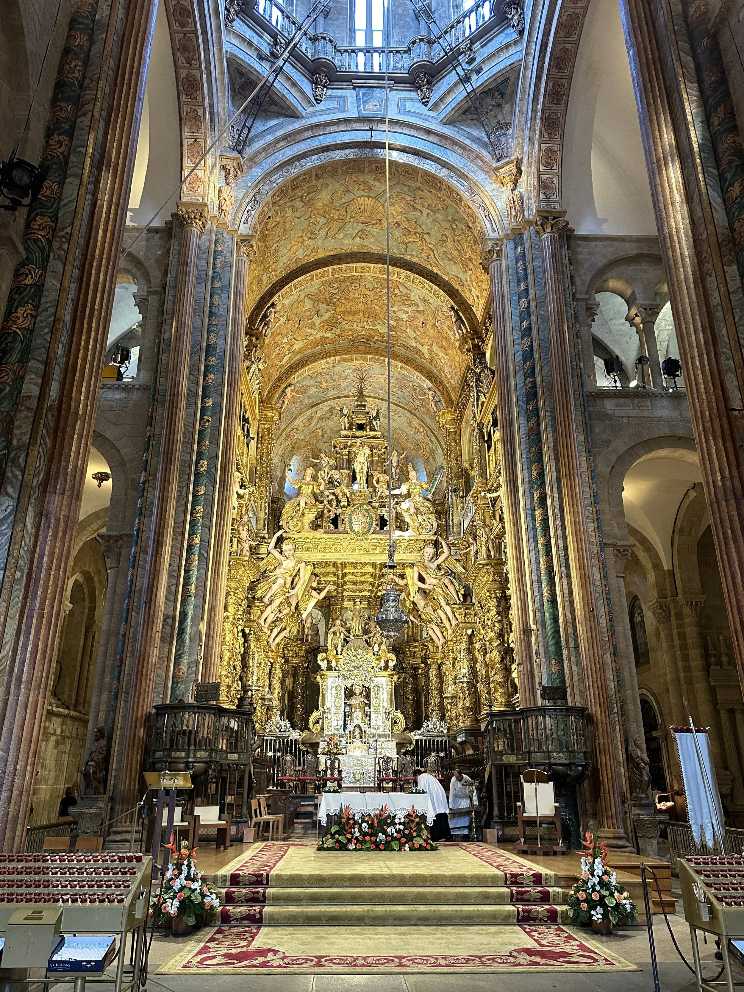Altar within Catedral de Santiago de Compostela. The silver ball hanging from the ceiling in the middle is the botafumerio.