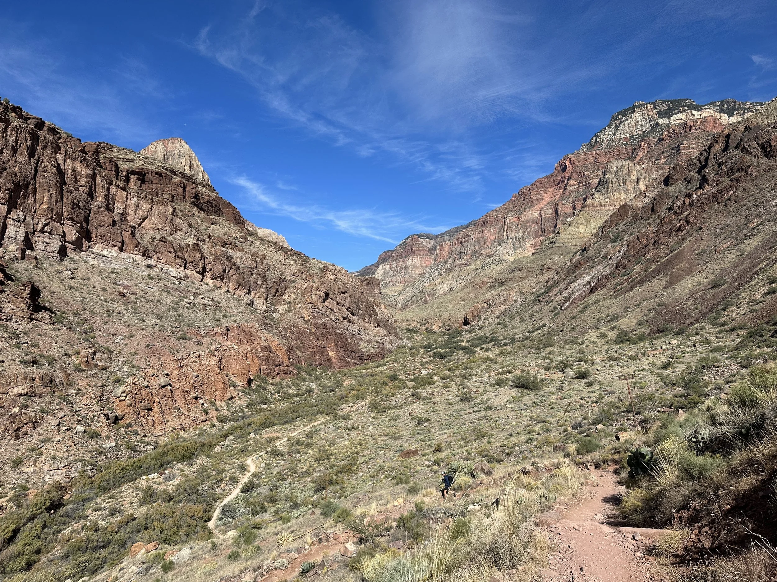 The next several miles of trail weaved gently through the high walls of a narrow canyon, hugging Bright Angel Creek. The trail was largely shaded and at every bend there was another phenomenal view down the canyon. It was my favorite section of the hike. Shawn, too, was grateful for any shaded sections because, no sunglasses.