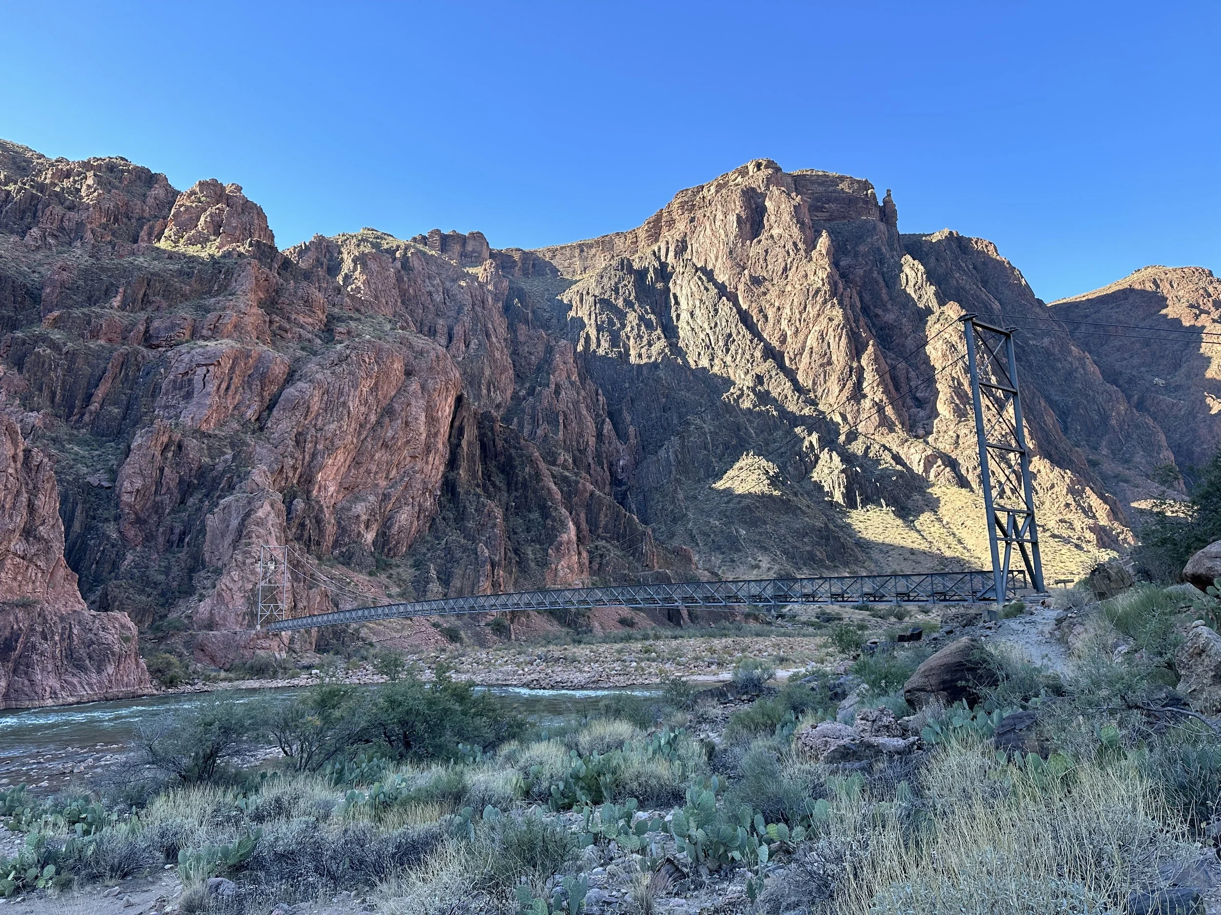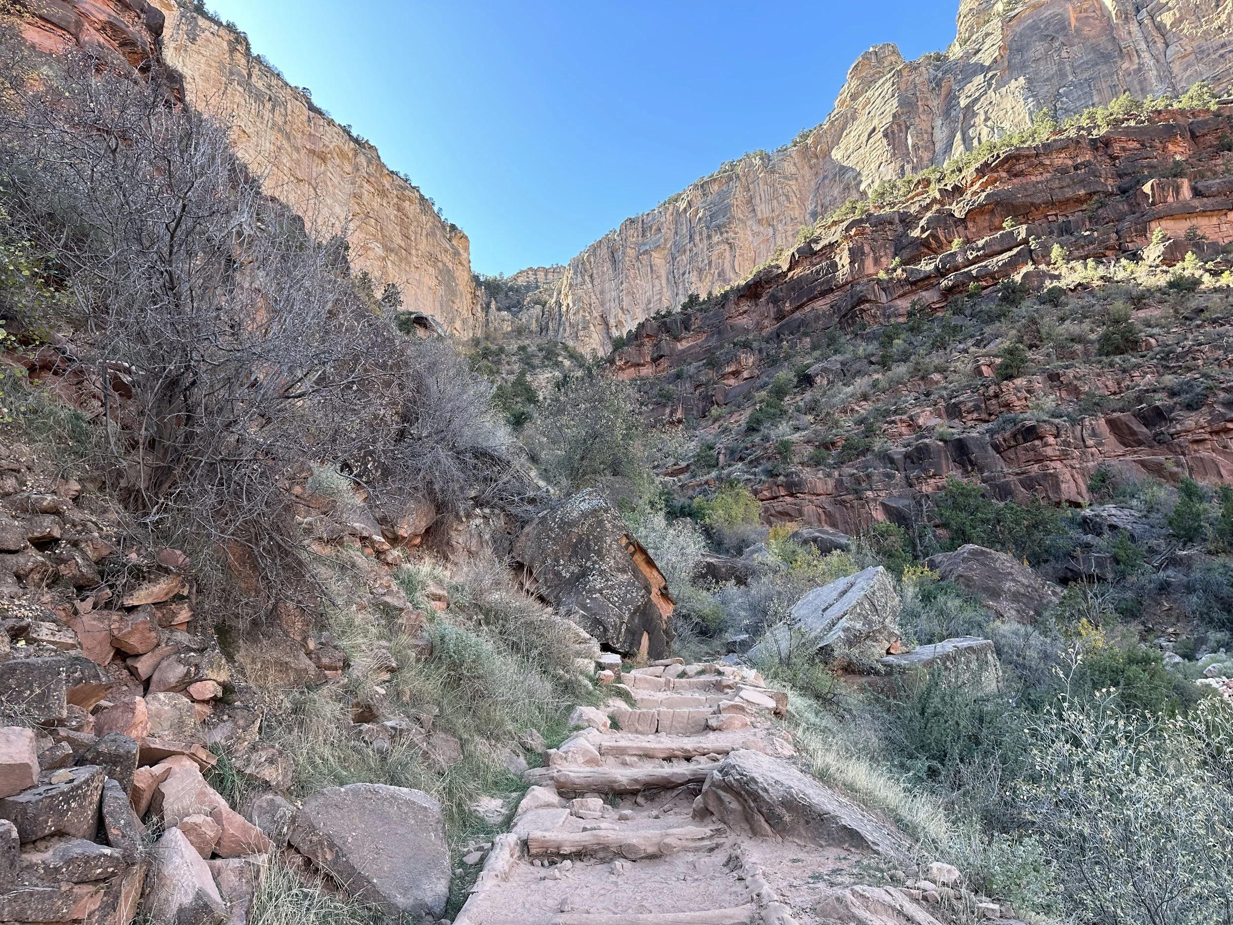The morning was cooler than yesterday and I started the day’s hike in a thin wind breaker and my rain pants for a bit of extra warmth. The majority of our first seven miles would be downhill and flat hiking back to Phantom Ranch, punctuated by only some gentle climbs. (Though a few ended up being less gentle than I remembered).