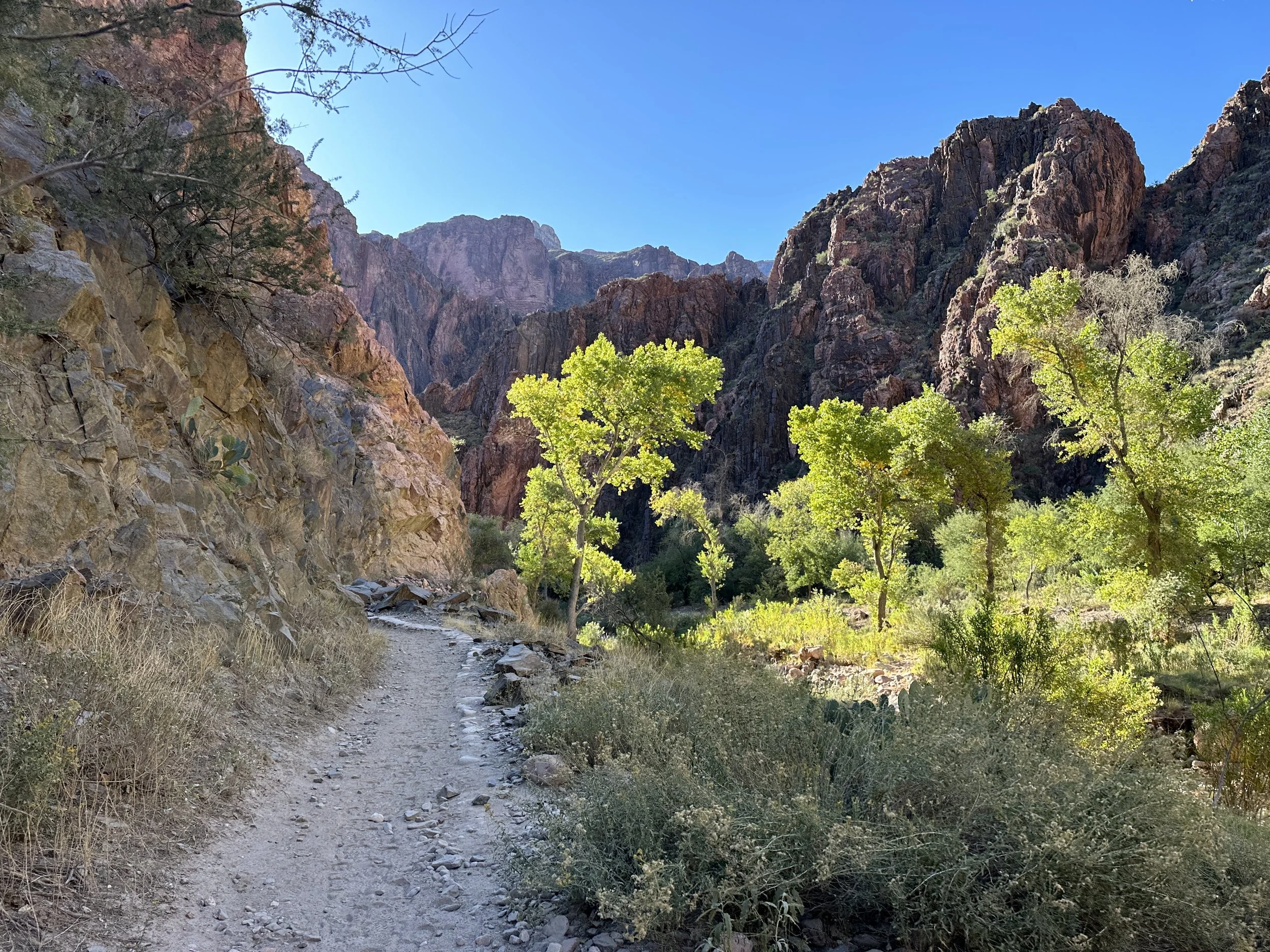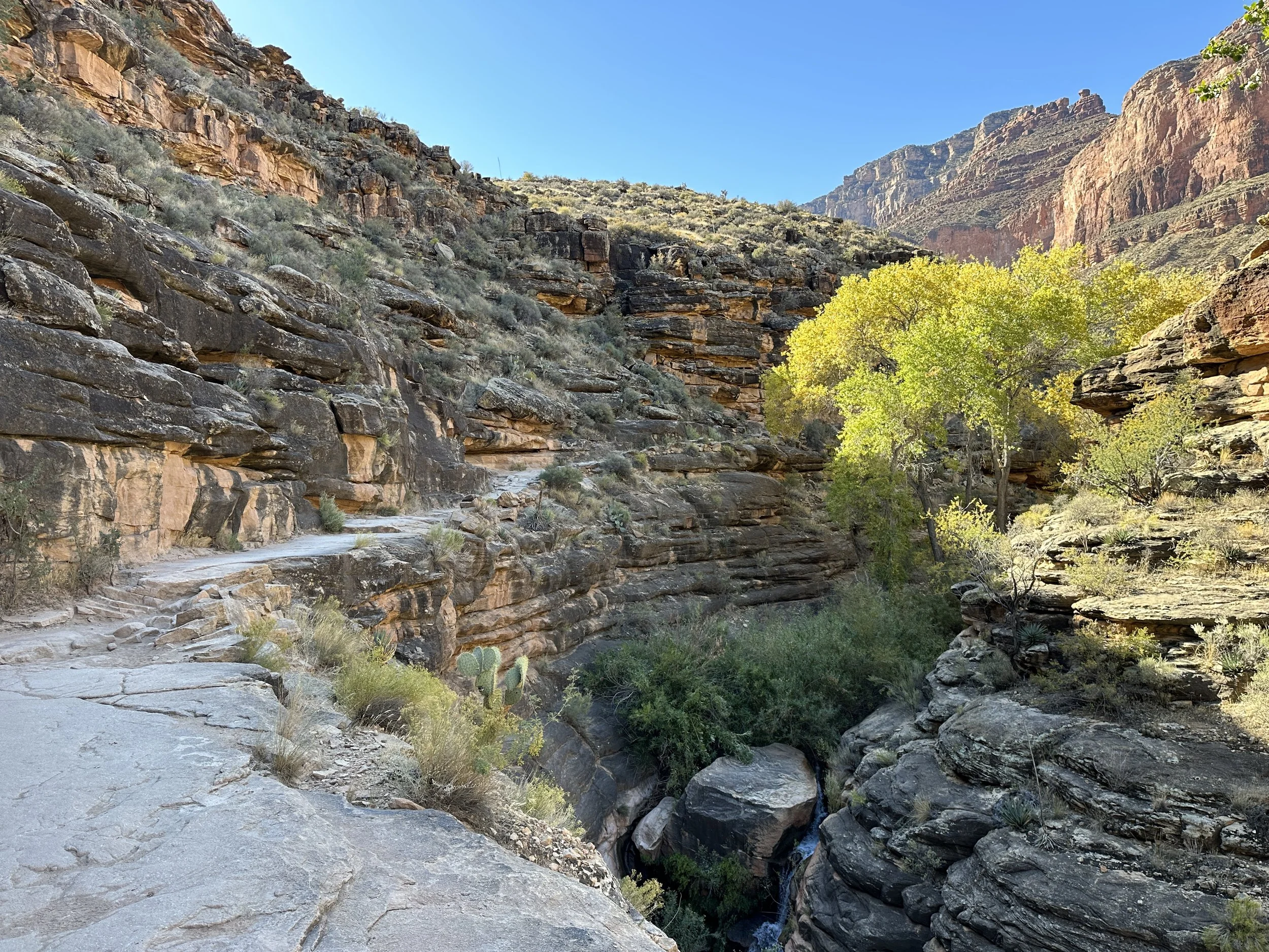 Bright Angel Trail was a really beautiful hike. The switchbacks were fairly gradual, much of it was shaded by canyon walls, and the vegetation along the trail in many areas was really quite incredible for what felt like a very arid environment. Tall trees burst with bright yellow leaves; thick bushes and a variety of cactus lined the trails; and even small wildflowers poked through the maze.
