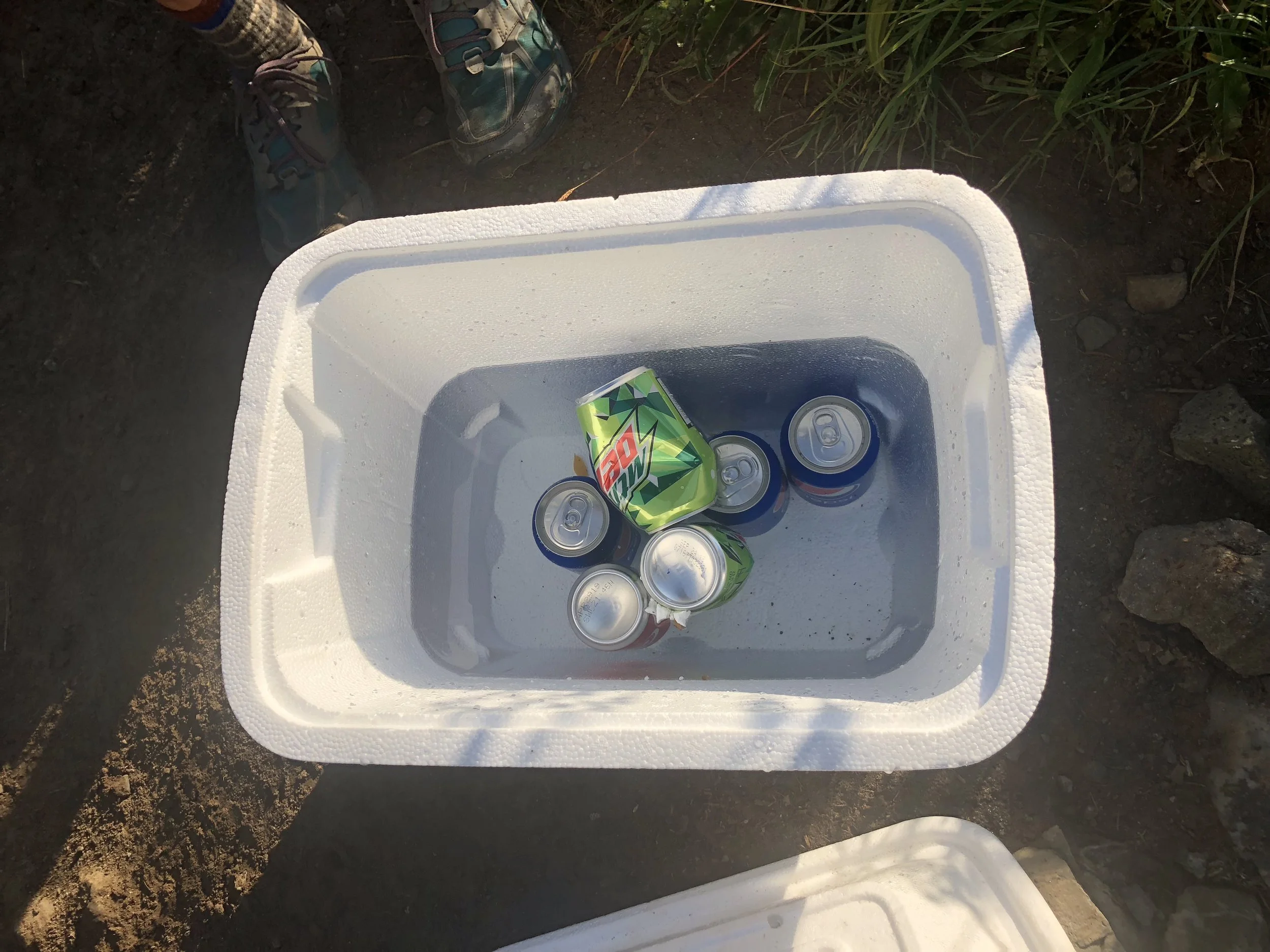 Along the trail high above a trailhead parking lot, we found a small white styrofoam cooler. Trail magic! A few full sodas were still left in the cooler.