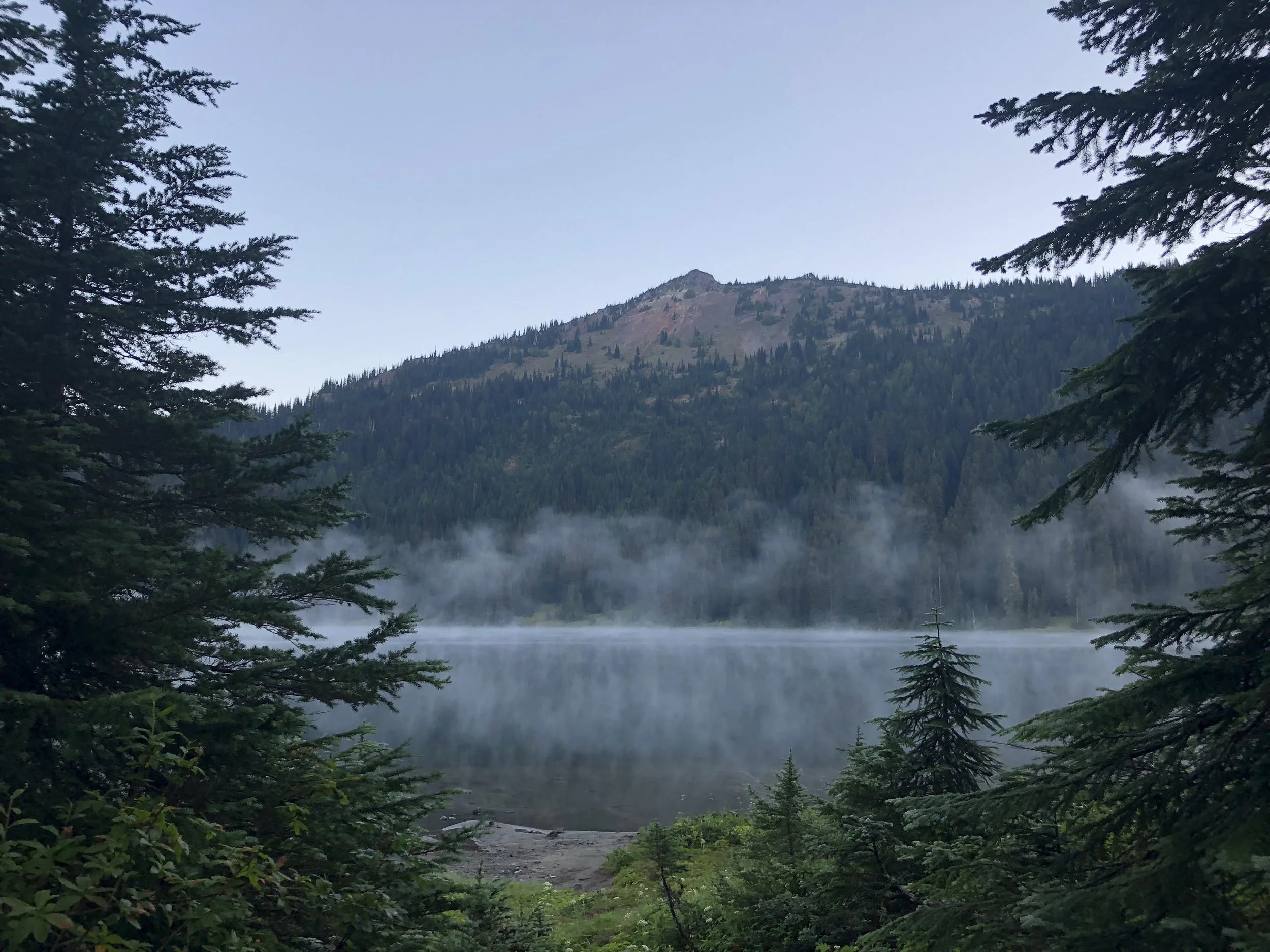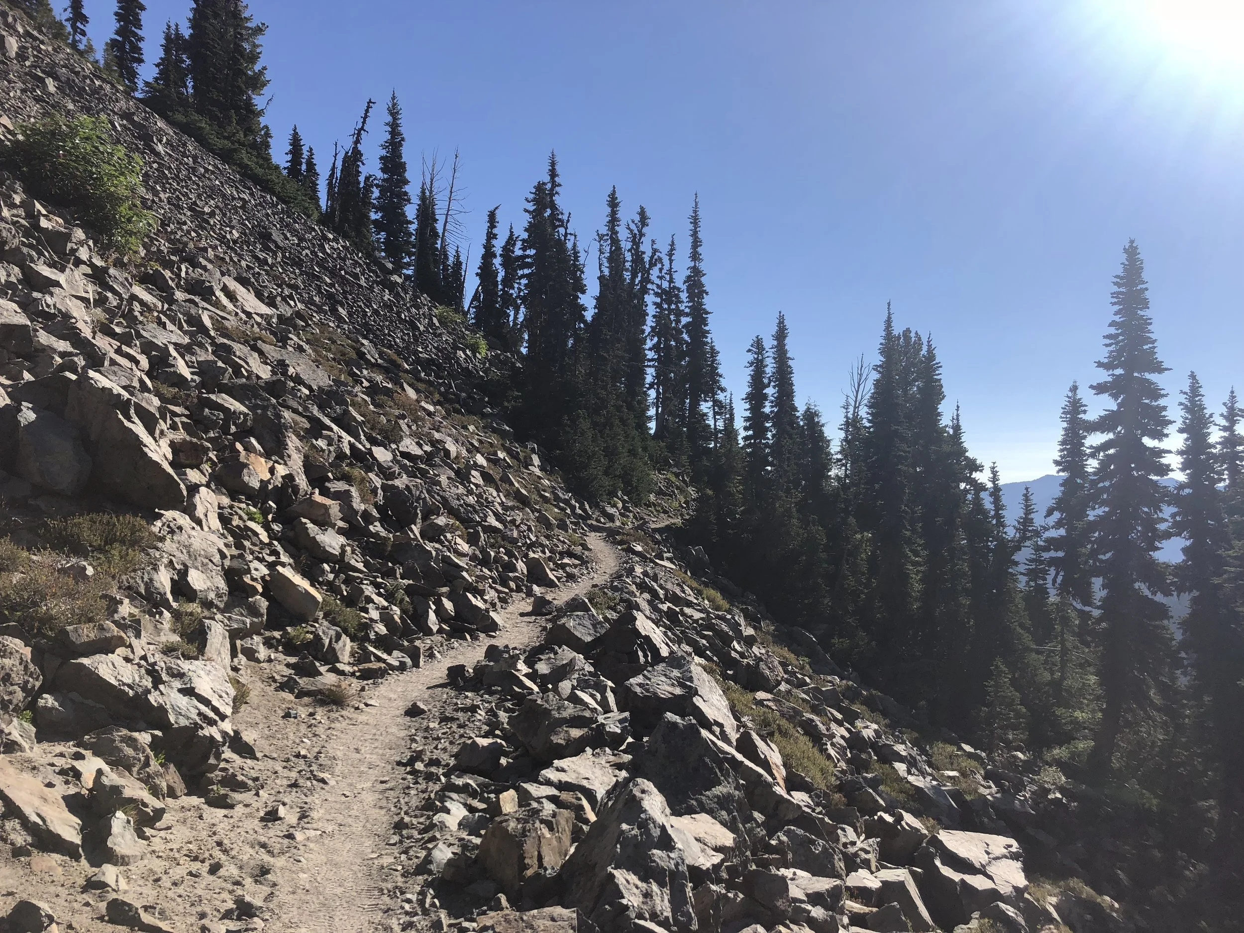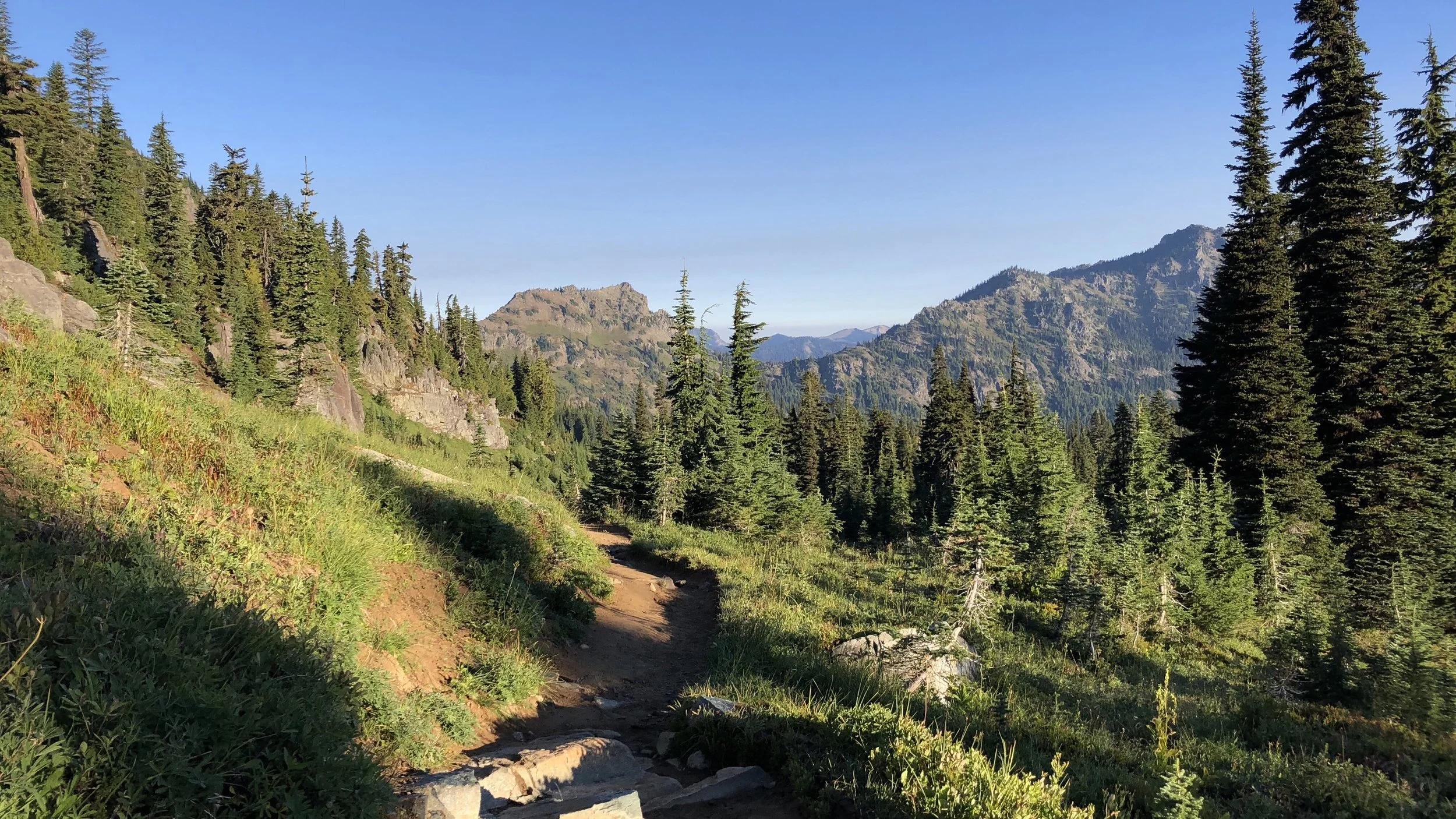The day started with a short but steep climb of about a mile before descending along nice, well-groomed trail to Highway 410, one of the major routes into Mt Rainier National Park.