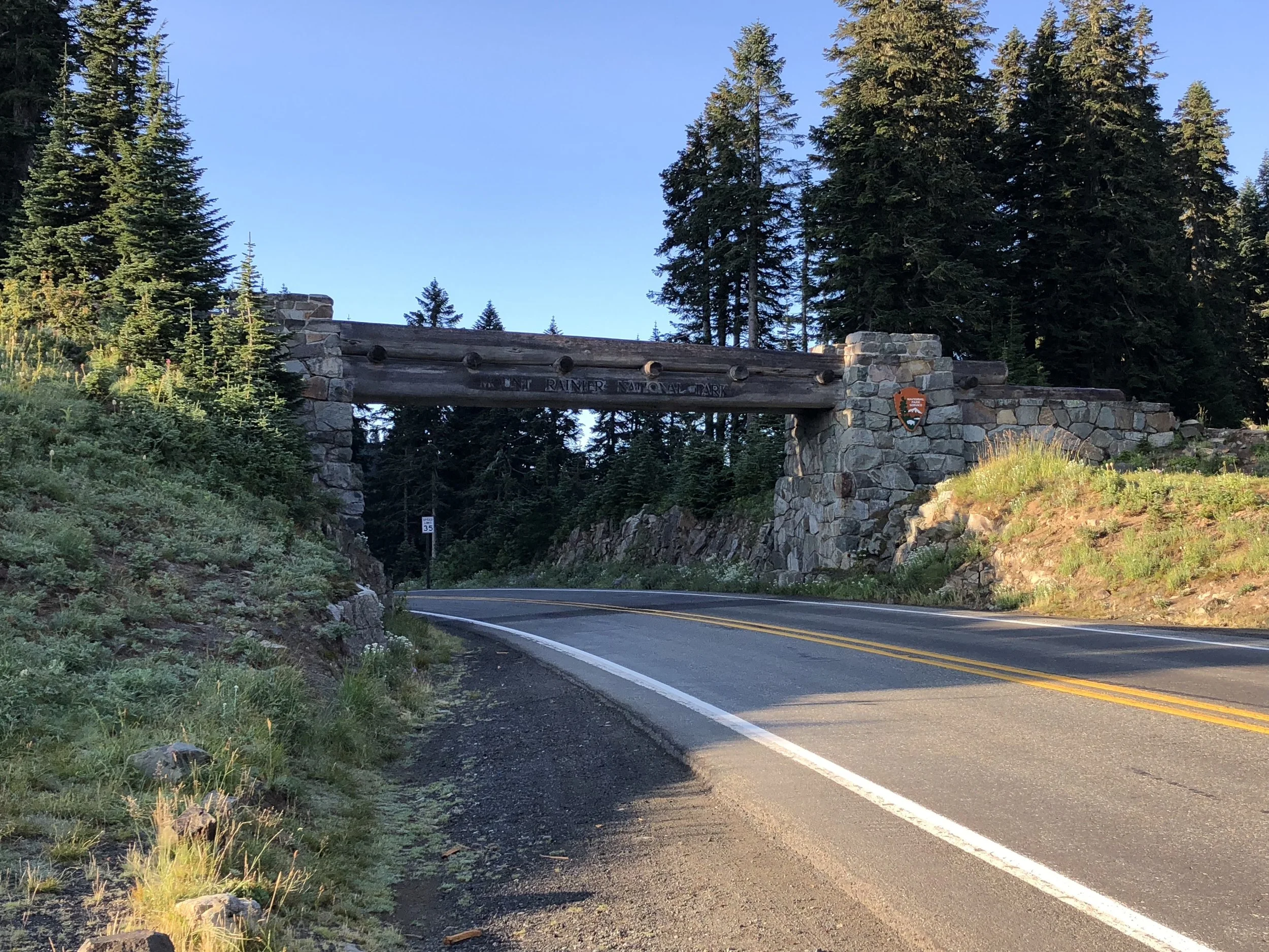 Heading toward the highway, we could see the domed snow covered peak of Mt Rainier, and the trail crossed the road right next to a park entrance.