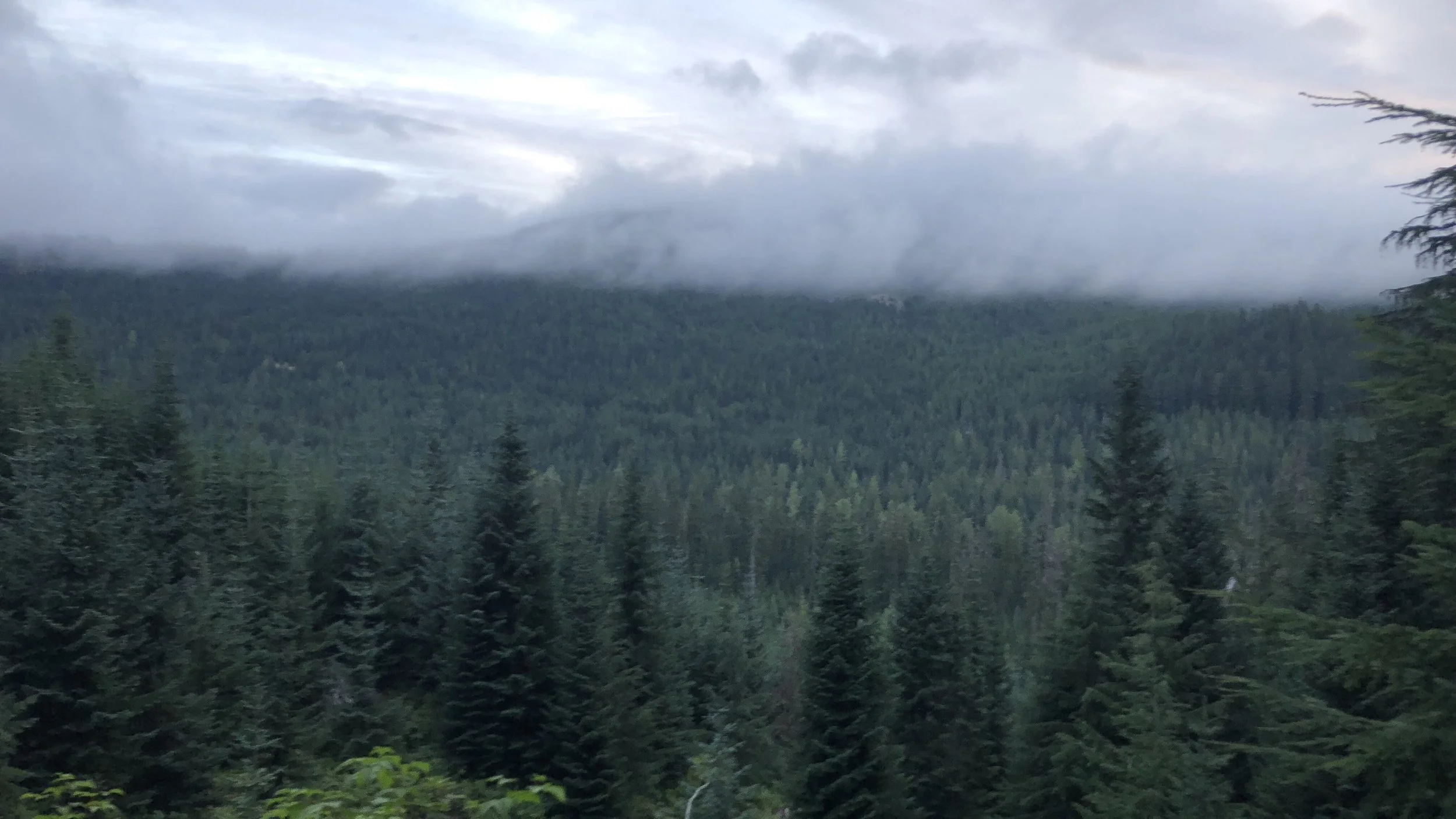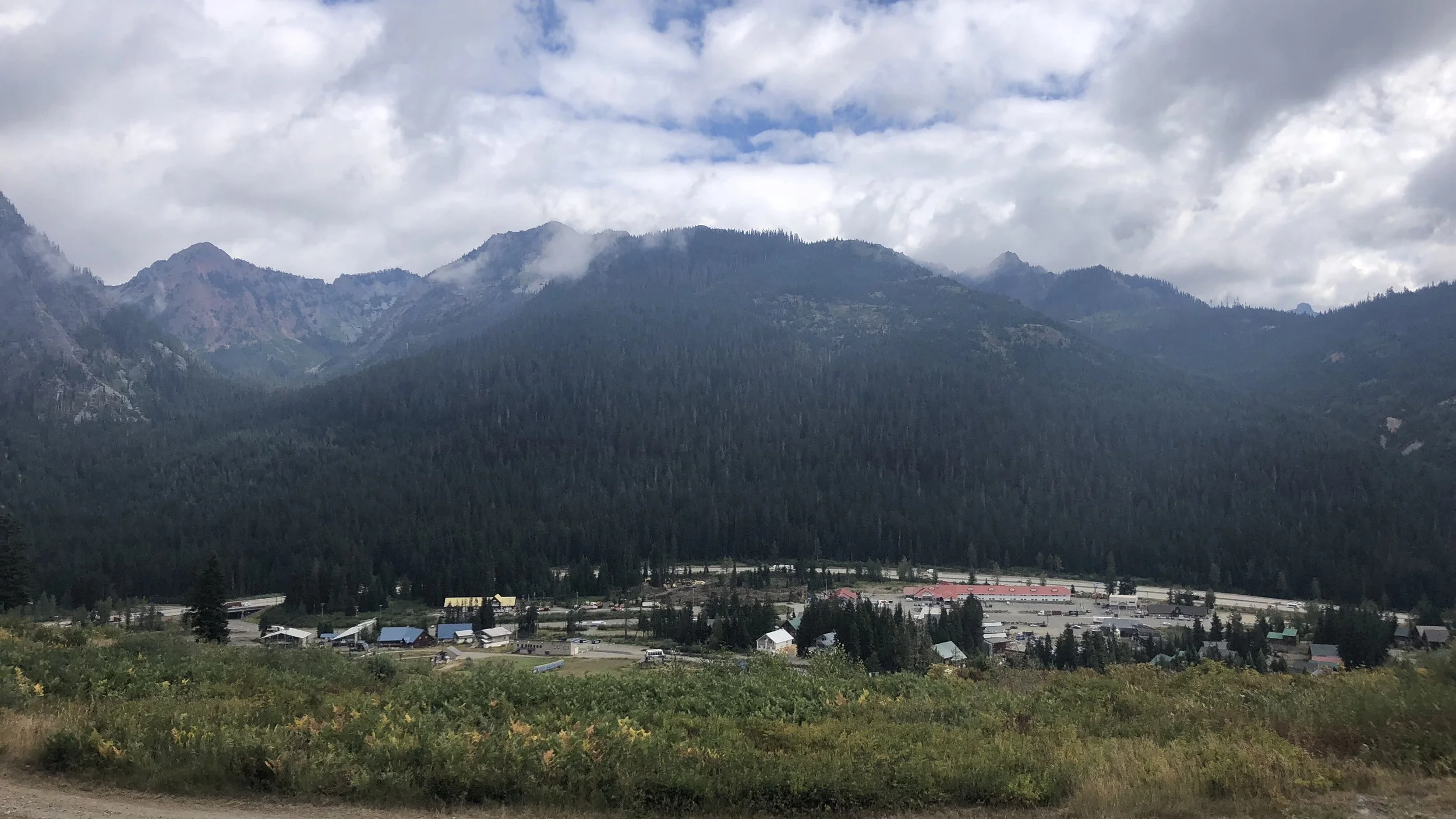 As we neared Snoqualmie Pass, a beautiful mountain scene came into view and soon we were looking down on the pass. To be honest, my first reaction was… it’s kind of ugly. While the surrounding mountains were beautiful, the populated hub below was dominated by I-90 and looked like a giant rest stop, trucks coming in and out from the highway, massive parking lots, and exit-ramp like amenities (all except for a fast food joint).