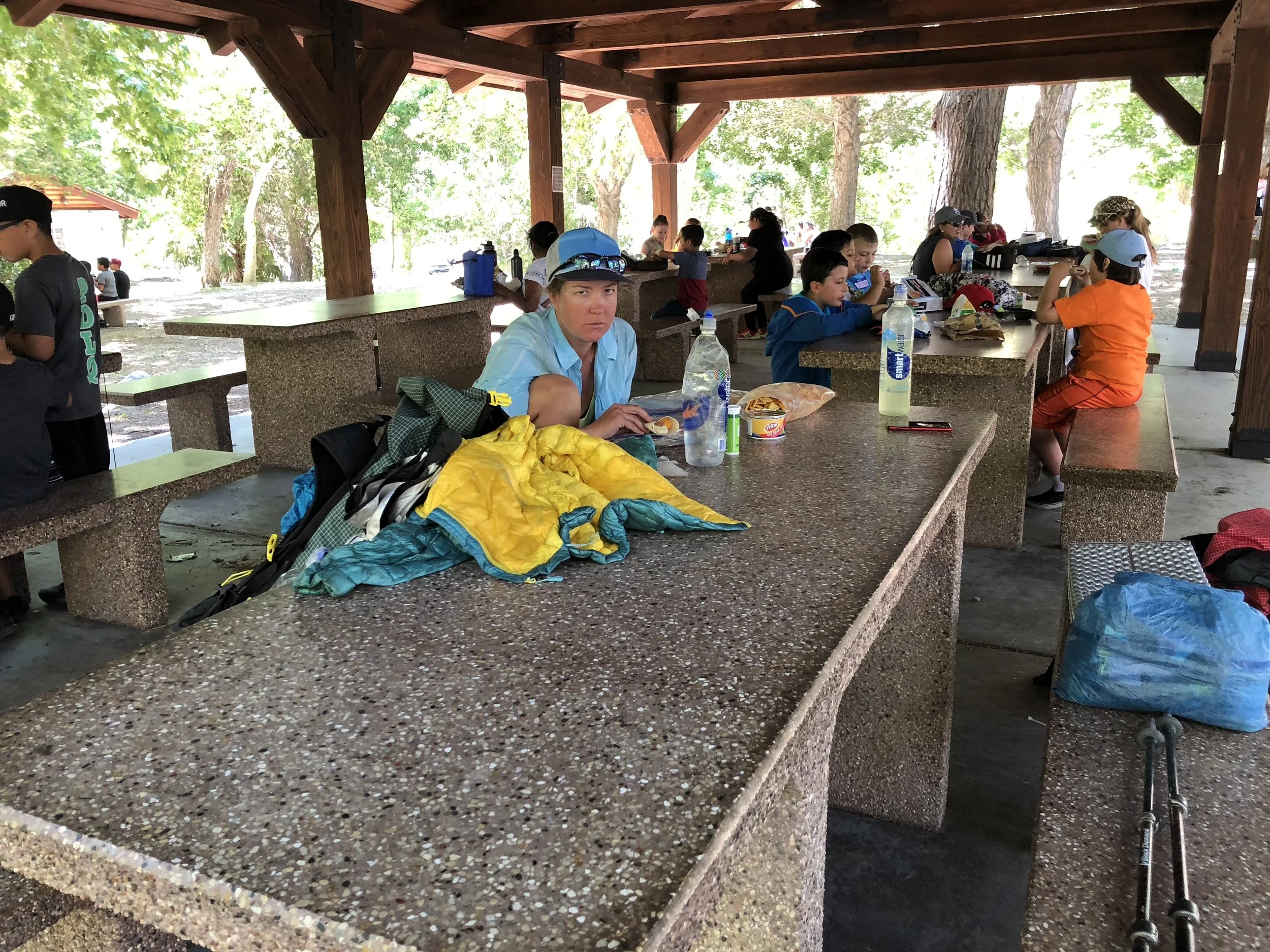 Sitting down at a picnic table in the shaded shelter, we could hear the tranquil sound of running water. And then… about 100 school kids descended upon the picnic area with box lunches. Tranquility lost. “Do you think anyone will sit with us?” Shawn asked. “No, we smell.” My mind jumped to potential lunch food trades. I’ll trade you this banana for your snack pack.