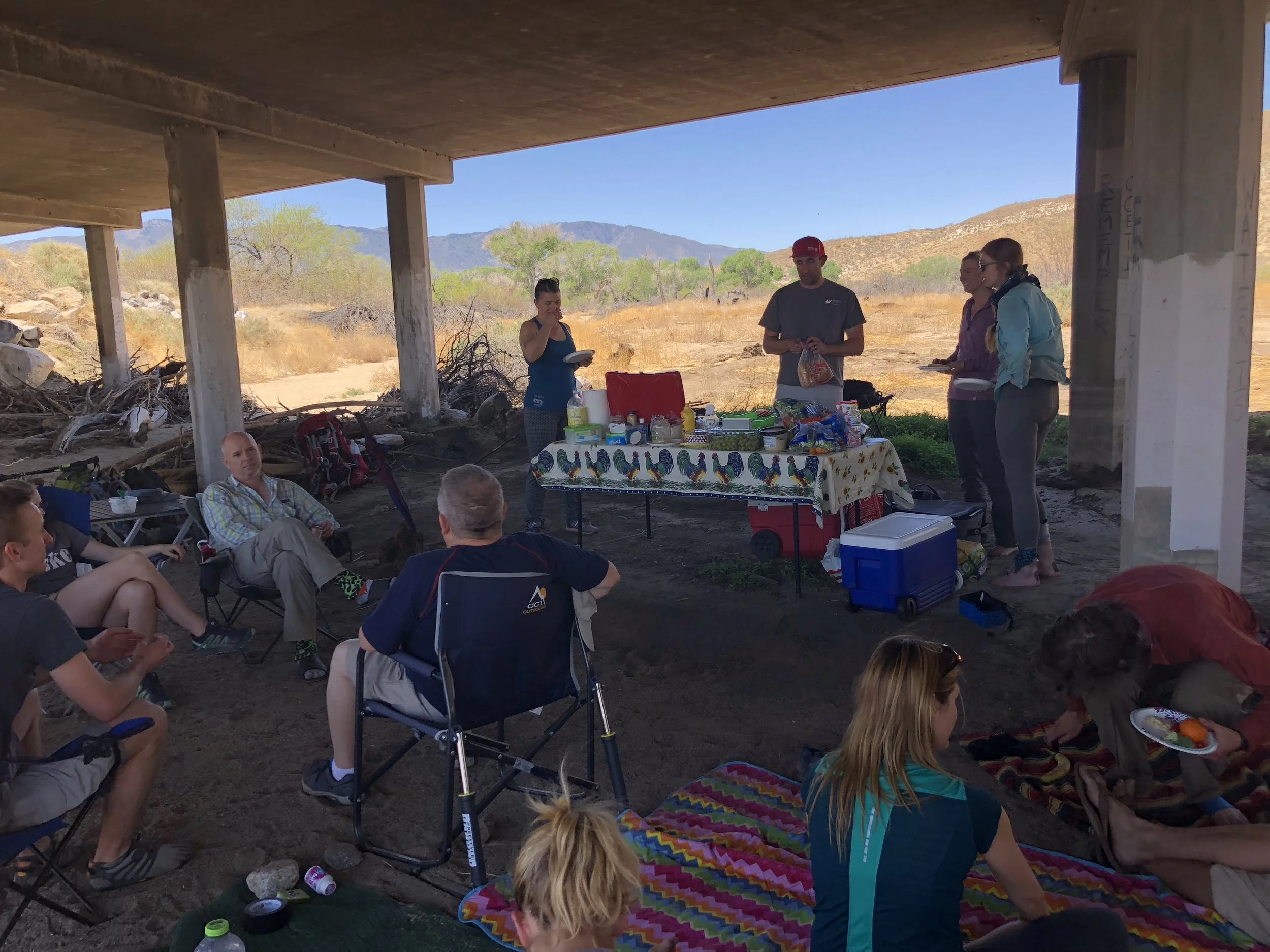Several hikers sat in camp chairs and on blankets in the shade of the underpass. Out of the goodness of their hearts, an awesome group of people had loaded up their truck on a Sunday and were serving a cookout feast to the weary hikers dragging themselves in from the desert. “Can I get you a hot dog?”, the guy by the portable grill asked. “Actually,” he said quickly, “you probably want ice cream first”, and he produced two chocolate-almond covered ice cream bars. Is this heaven?