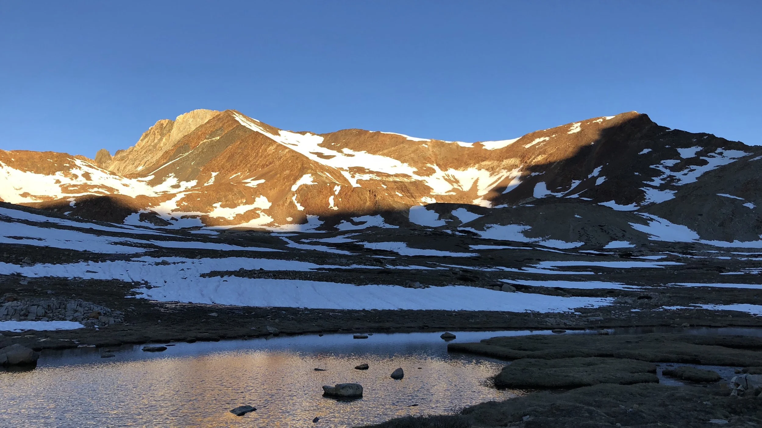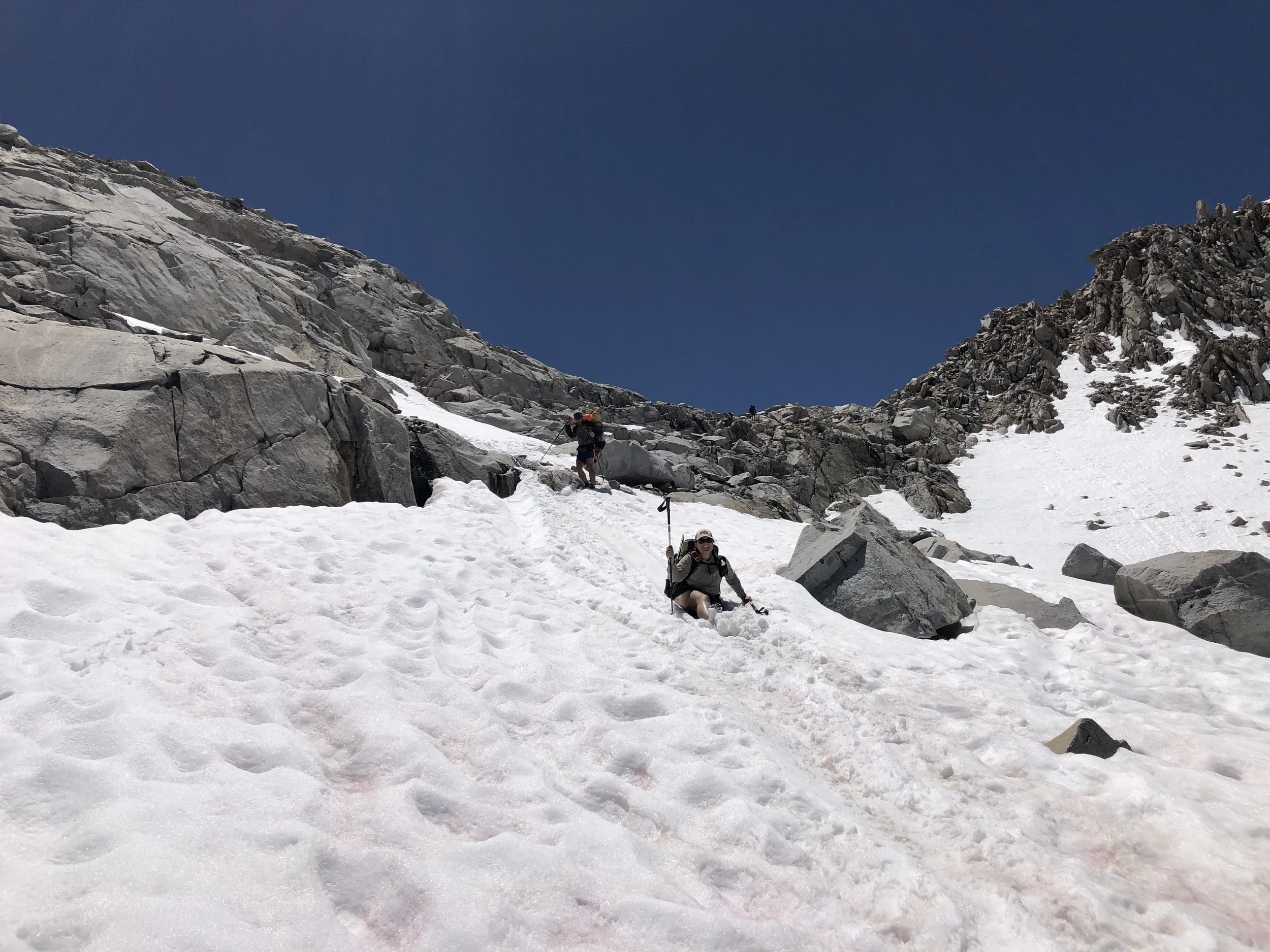 This climb was mostly far less steep than yesterday and this morning’s climb to Pinchot, until we neared the final ascent to the pass. Crossing over several snow fields, we eventually scrambled up the rocky mountainside to the first visible switchback, the lower portions of the trail covered in snow.