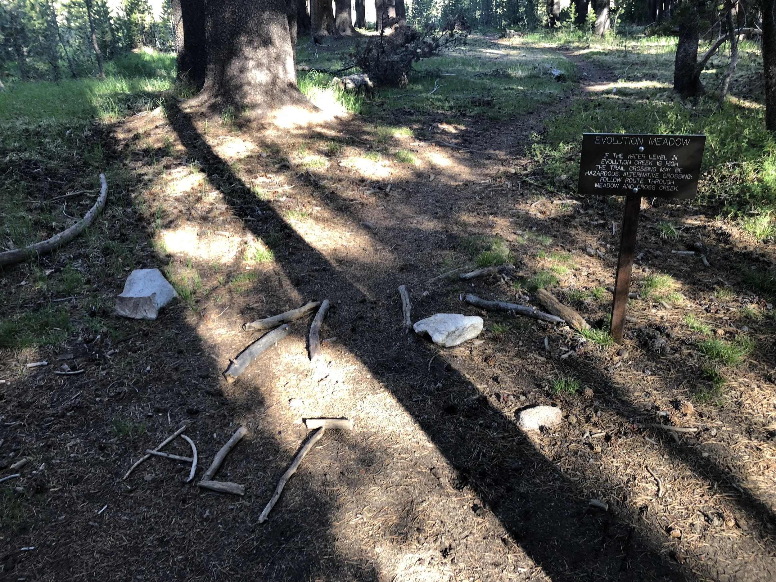 Around five miles into the hike we approached the junction for Evolution Creek, a high current river crossing along the PCT. While we had deftly avoided wet feet all morning through a combination of rock hopping, log crossing, and jumping, there would be no avoiding wet feet at this river crossing. An alternate trail leads upriver a bit to a section with a bit less current and, watching three other hikers head down the alternate trail ahead of us, we took this path as well.