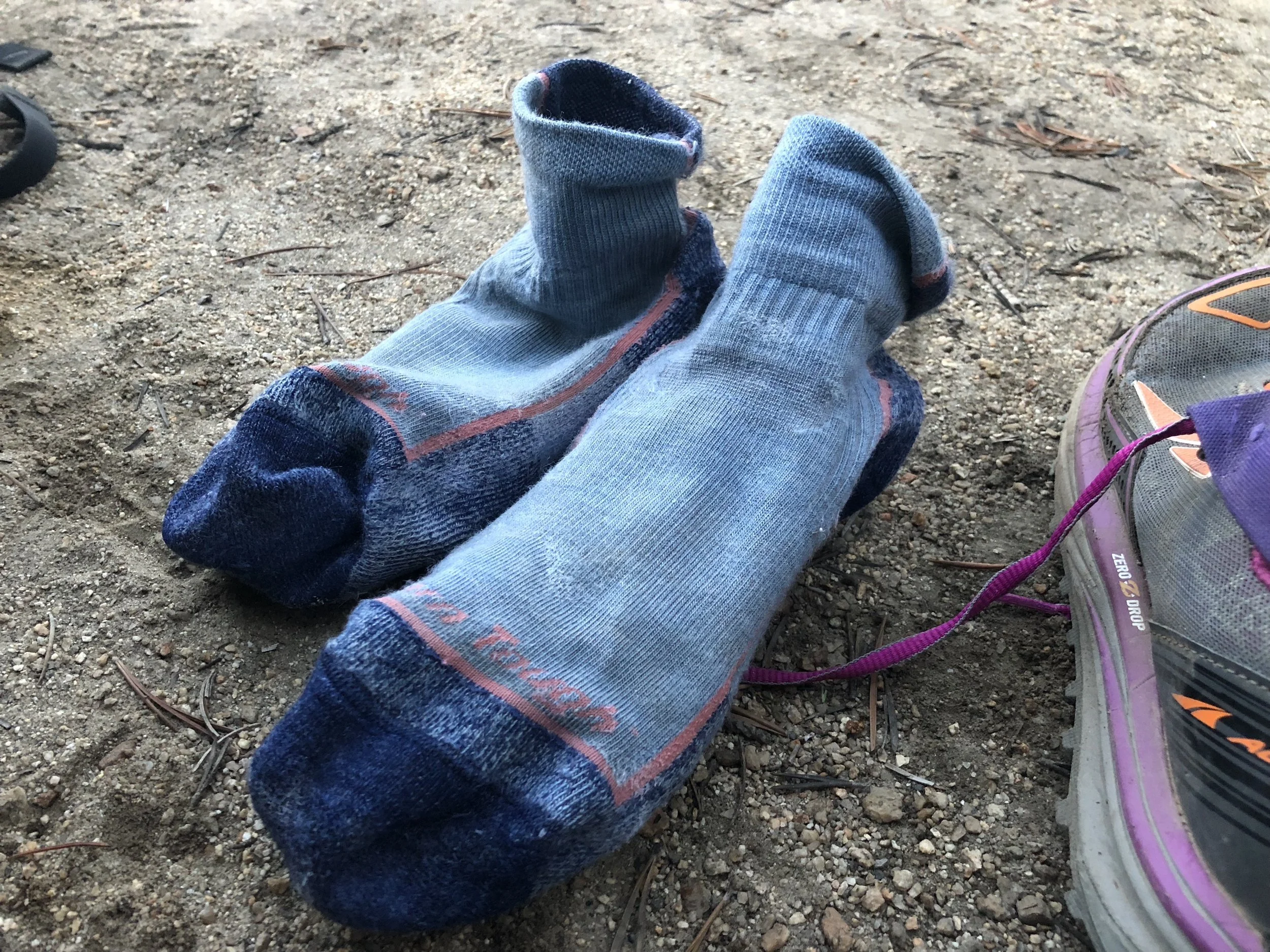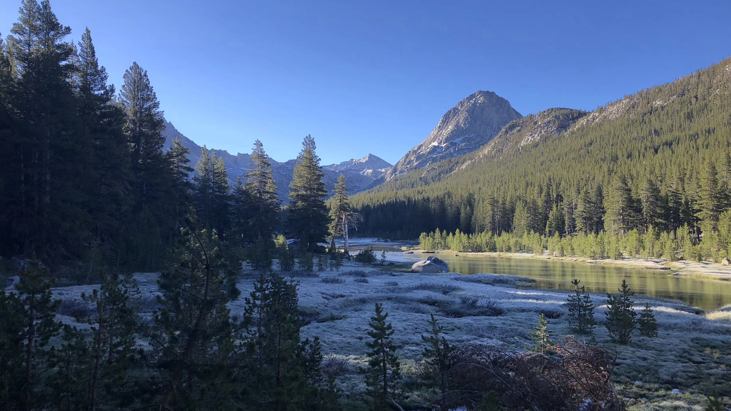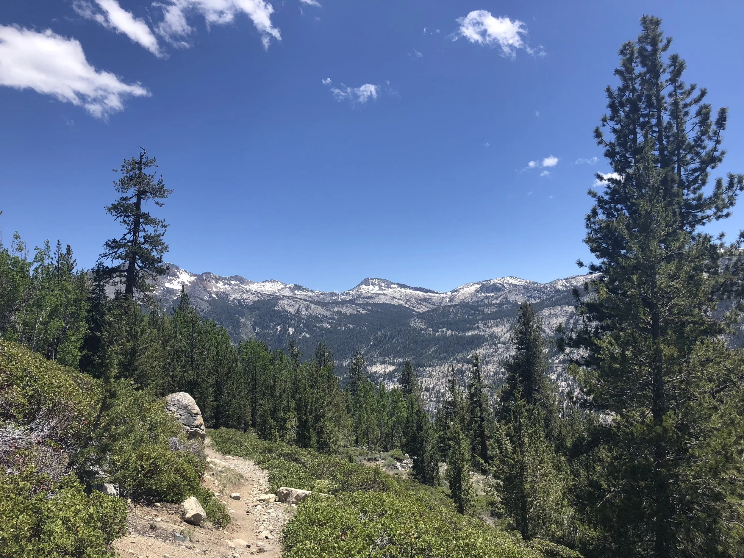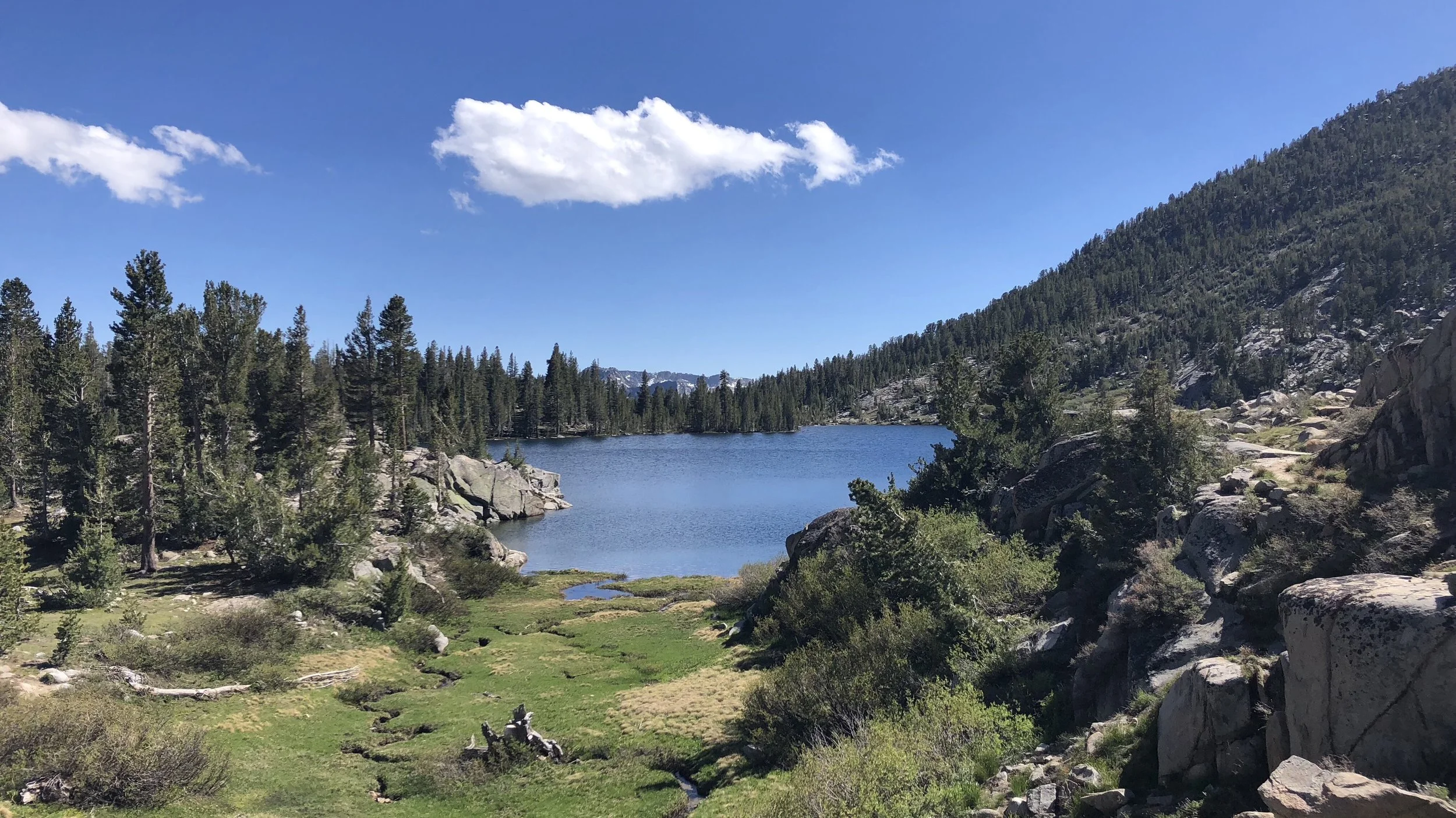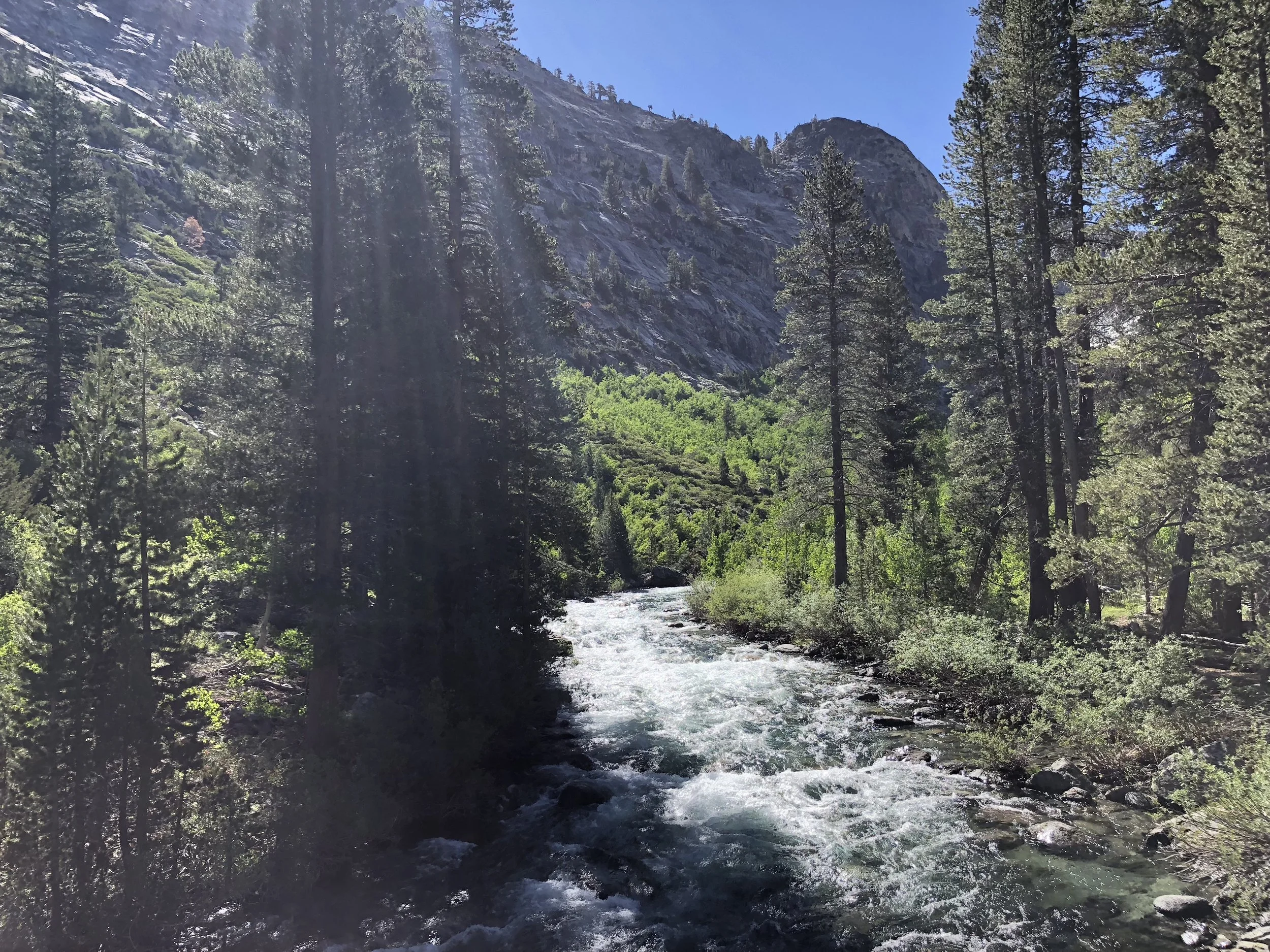 We took our lunch break at the bottom of the long descent, just shy of 13 miles into our day, now at 7,894 ft elevation. Typical for the Sierras, lunch began with us laying our tents, sleeping bag (me), and socks and shoes in the sun to dry. The side of my sleeping bag had collected more condensation than usual last night and I wanted to make sure it was nice and dry for tonight.