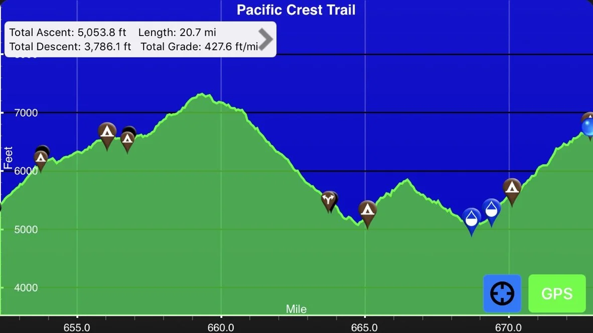 To track our mileage/location on the trail, Shawn and I used the Guthook’s Guides app, one of the most popular mapping apps for the PCT and other long distance trails, as well as many other trails throughout the U.S. and abroad. In addition to providing offline mapping, PCT mile location, current altitude, elevation ascent/descent, topography maps, and other useful mapping features, “Guthooks”, as its most often referred to on the trail, also includes information about water sources and tent sites, to which users can add comments with updated information about the source or site. It’s a pretty handy little tool.